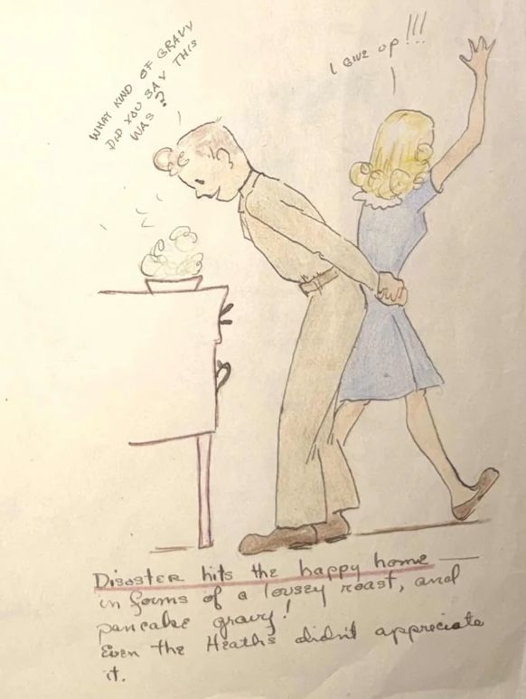 But eventually, the chronicle takes a dark turn as Art is deployed to Europe in 1944. Grandma went to stay with her parents and cursed Hitler, and her diary entries involved other people and a longing for Art's return. Ok_Illustrator_8711 assures us he returned, and they lived happily ever after, until Grandma passed in 1977. Grandma could have been a comic illustrator, but it was just a hobby for her. See the diary pages at this reddit post, where you can click to enlarge the gallery. -via kottke